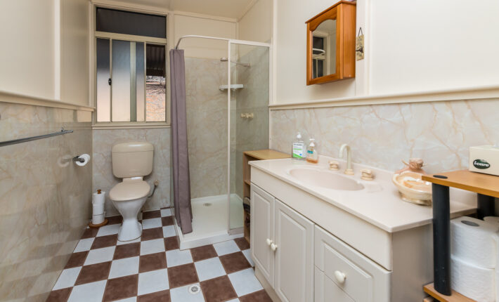 The other wing is the business end, with laundry, family bathroom and two bedrooms – one of which could be split for the extra space. There is wrap around verandahs and solar panels for cheaper power. A large tank catches rain water for household use.