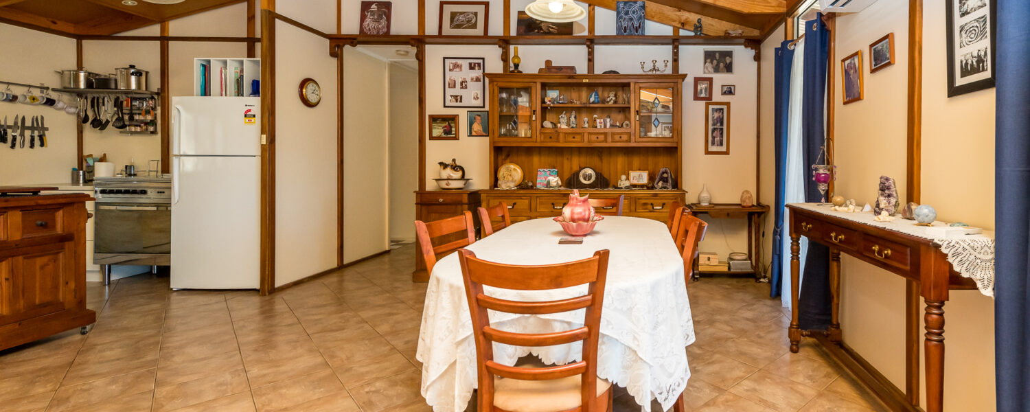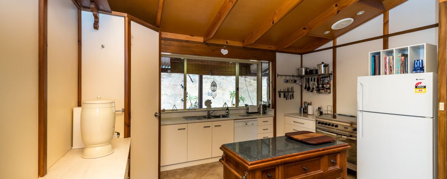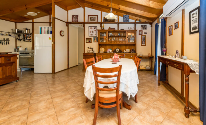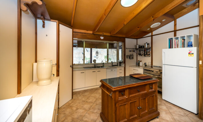 Inside the kitchen has a real country feel, with the open plan living having raked ceilings and exposed beams, split system aircon and a warm log fire for winter warmth.