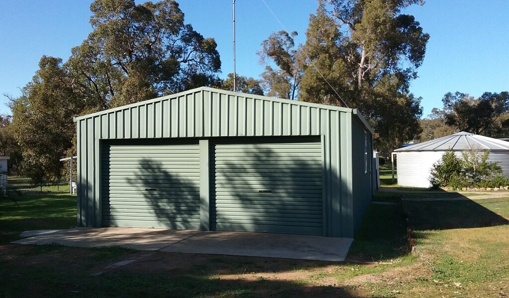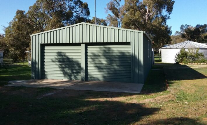 Outside is a large shed with double roller doors,