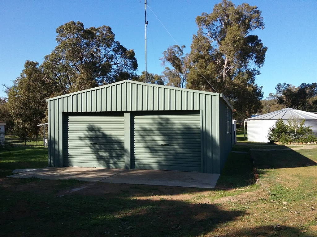 Outside is a large shed with double roller doors,