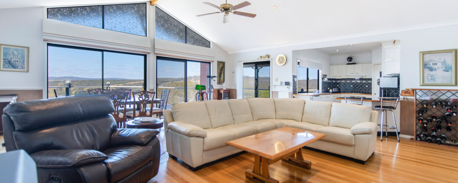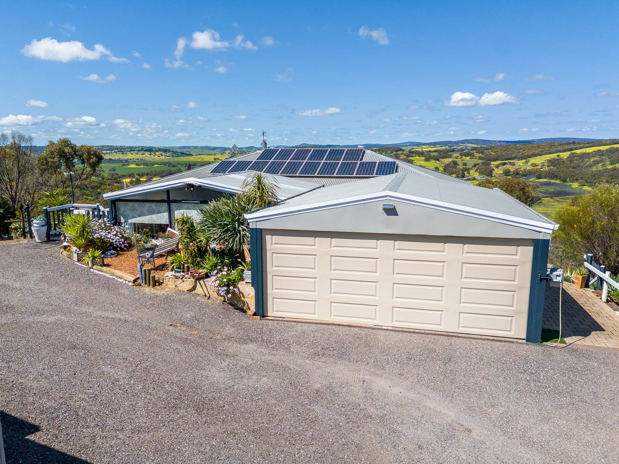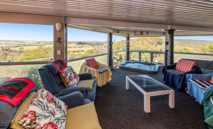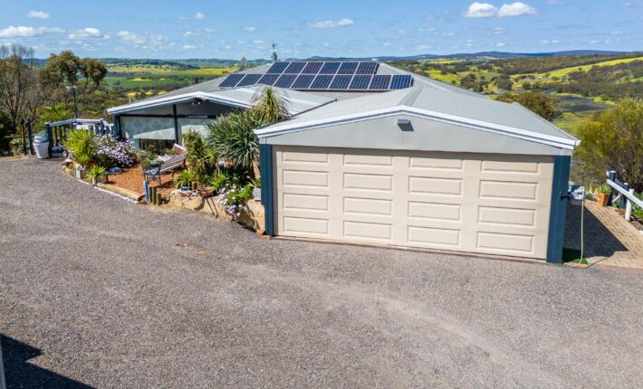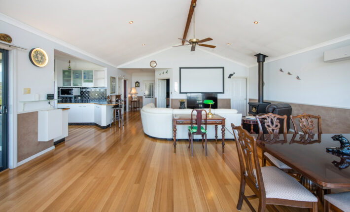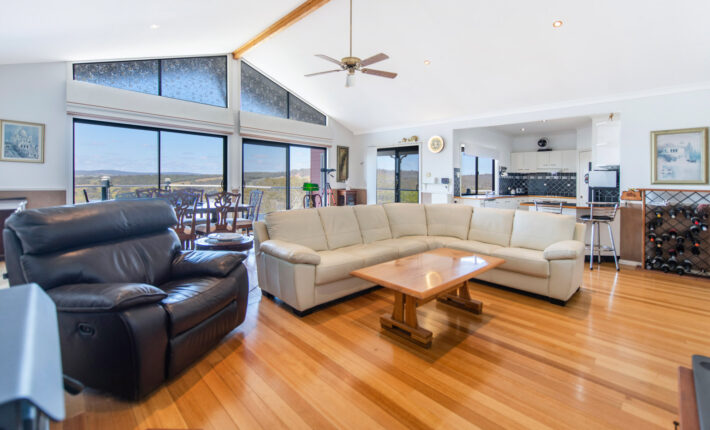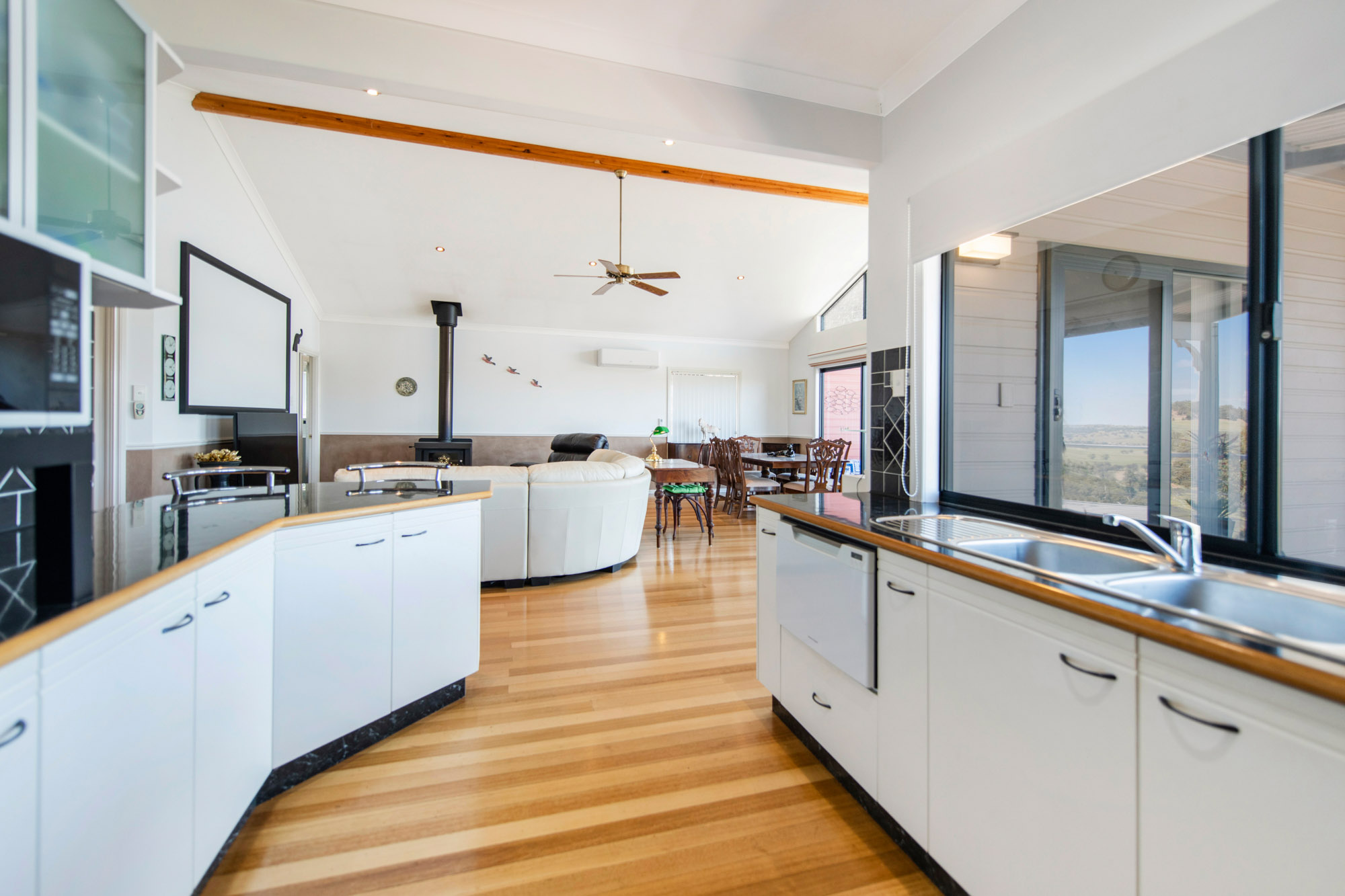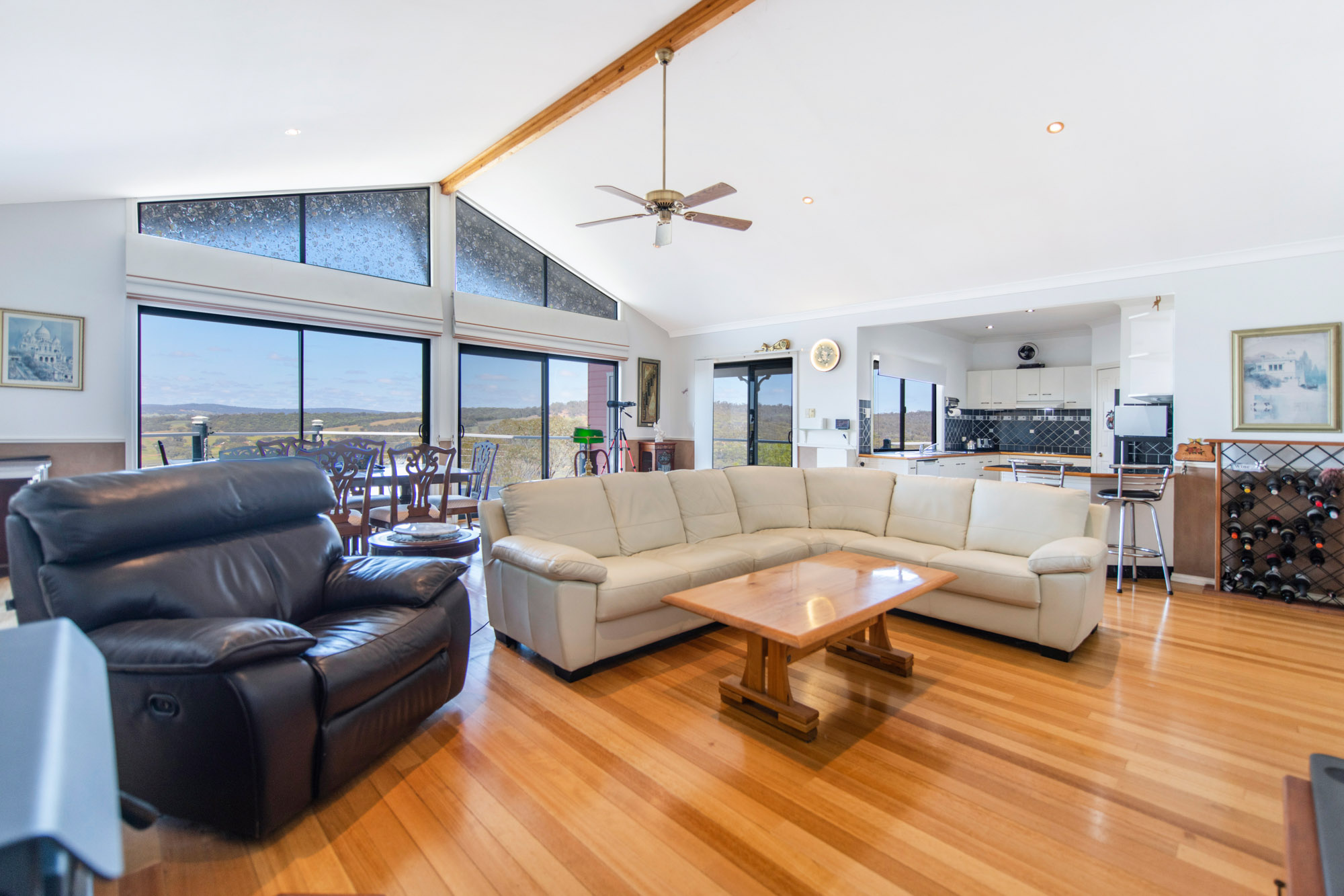 This distinctive home is set on 5 acres of natural bushland overlooking farmland and the hills beyond. Everything about this exclusive 3×2 has relaxation and enjoyment in mind. The sunroom is so warm and cosy in the wintertime, with ceiling fan, and laundry and toilet leading off. Enter the main dwelling and the open plan living draws in the expansive scenery through the wall of glass and onto the relaxing deck for those afternoon sundowners.