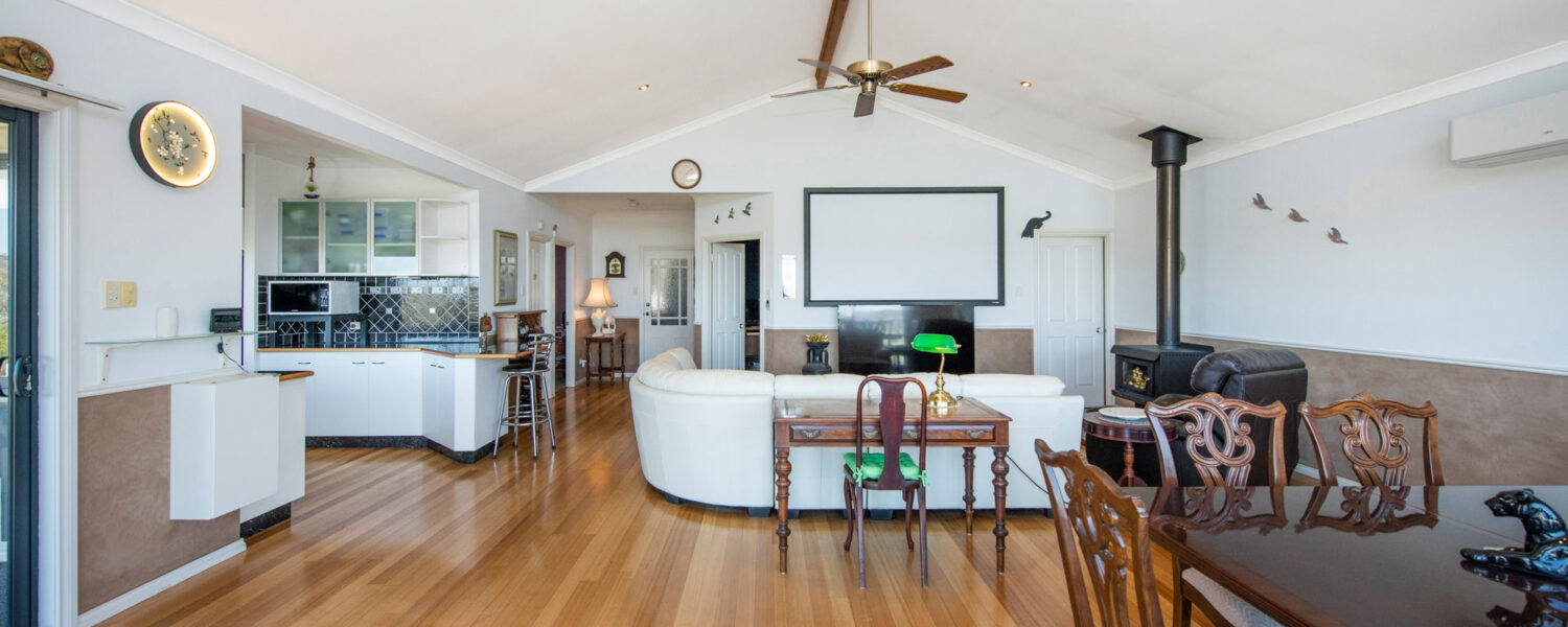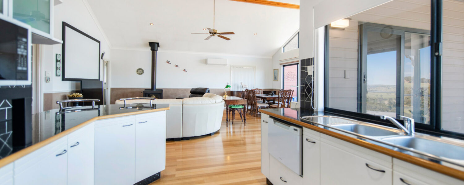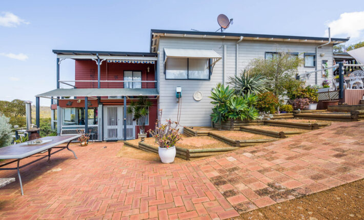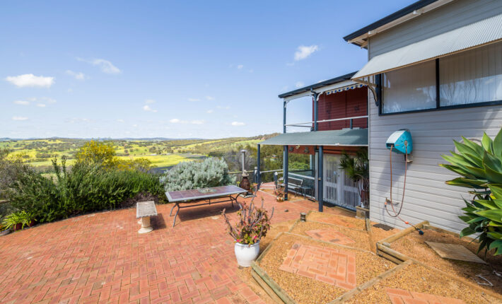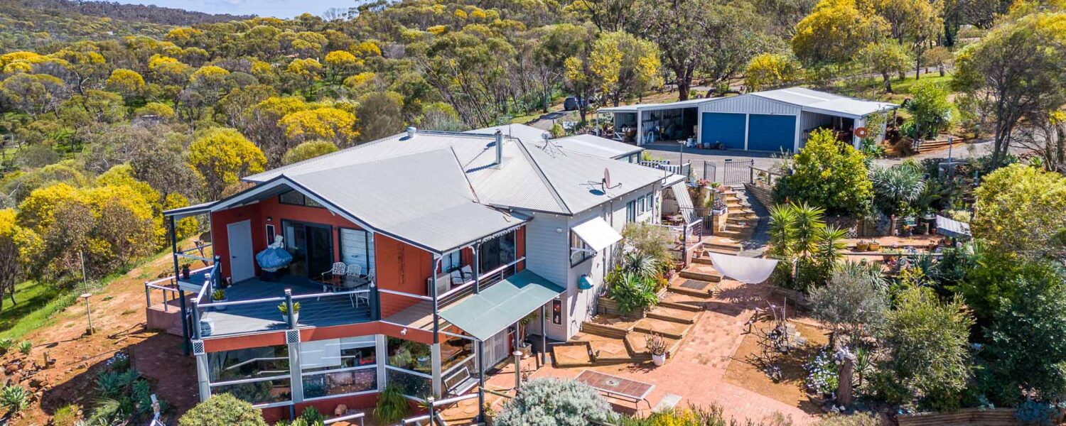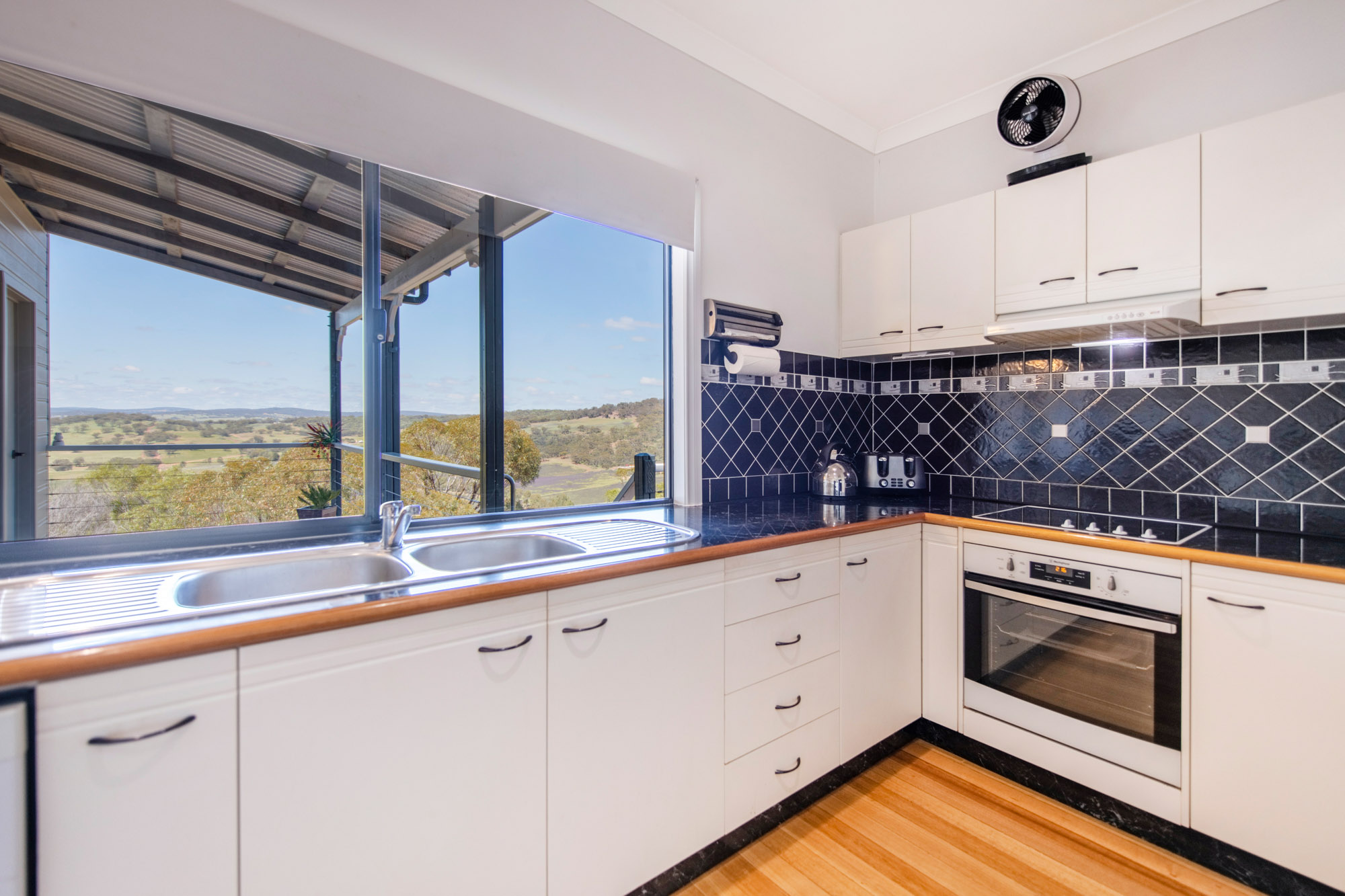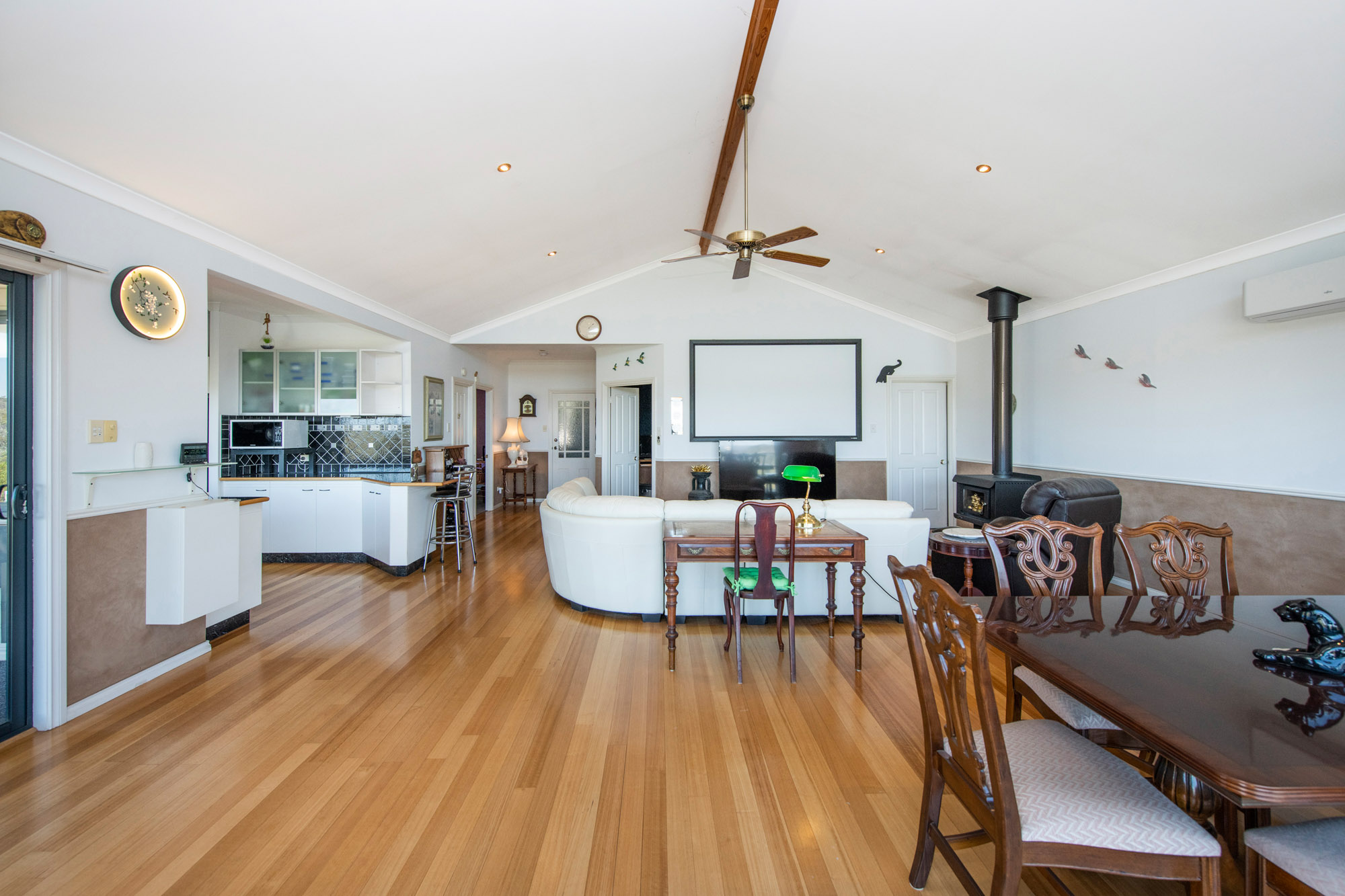 This distinctive home is set on 5 acres of natural bushland overlooking farmland and the hills beyond. Everything about this exclusive 3×2 has relaxation and enjoyment in mind. The sunroom is so warm and cosy in the wintertime, with ceiling fan, and laundry and toilet leading off. Enter the main dwelling and the open plan living draws in the expansive scenery through the wall of glass and onto the relaxing deck for those afternoon sundowners.
