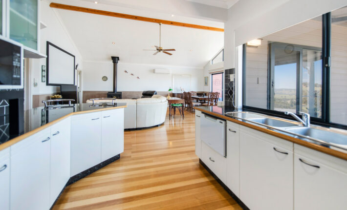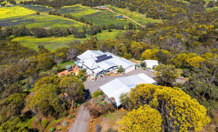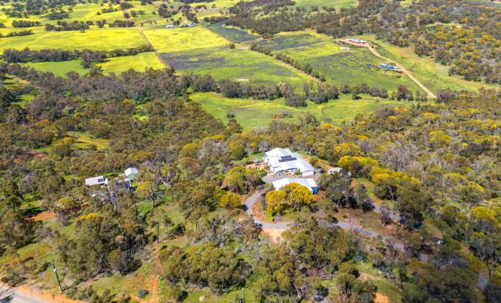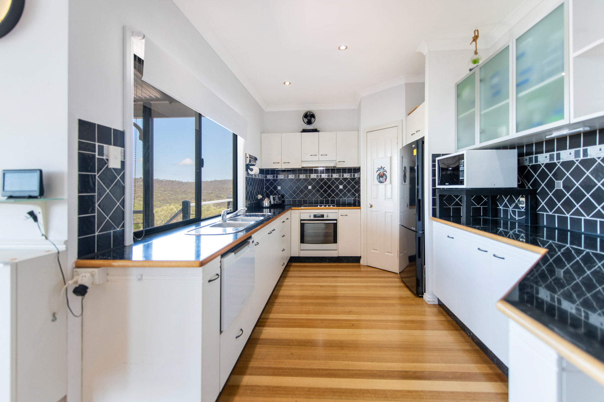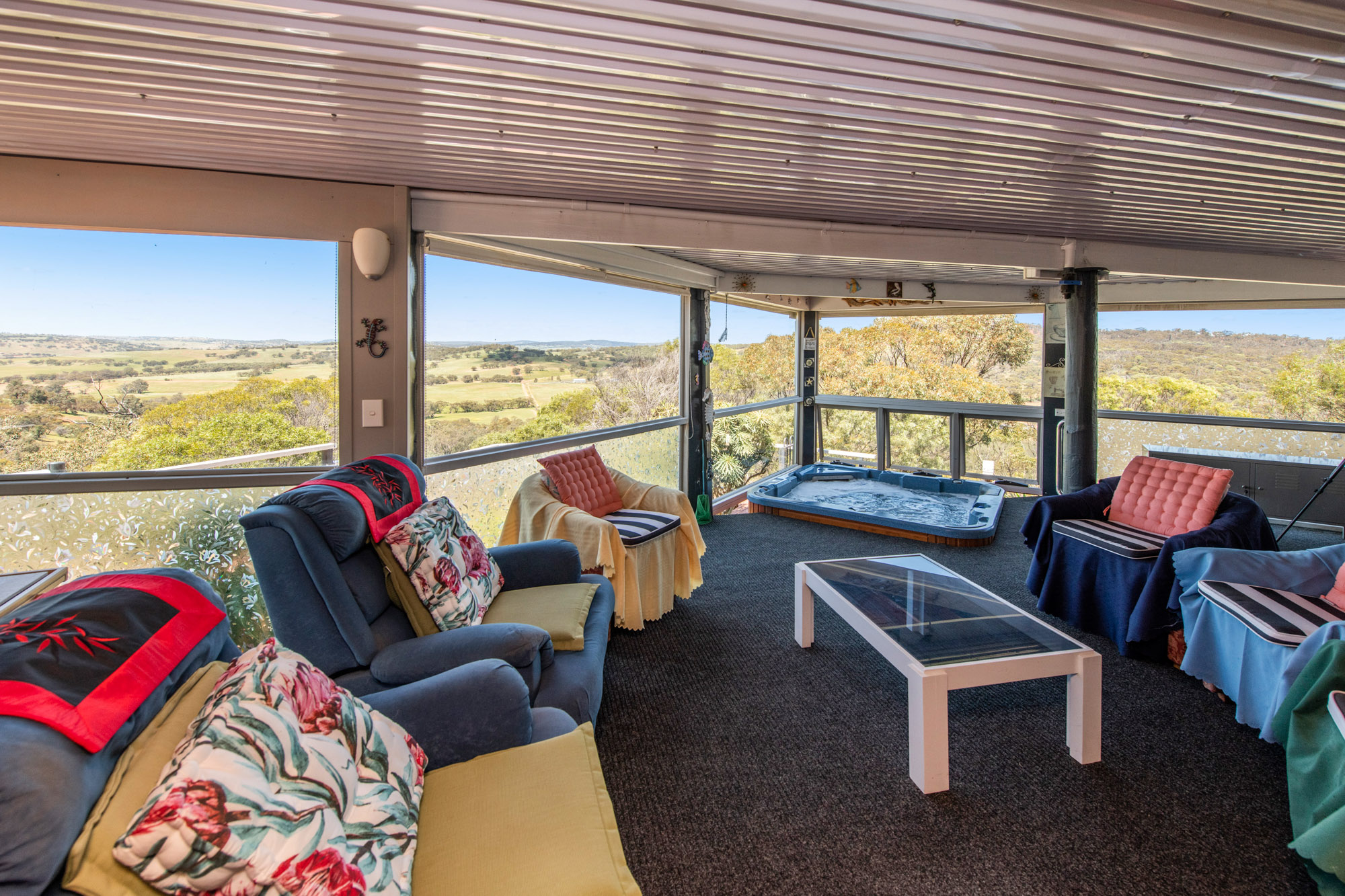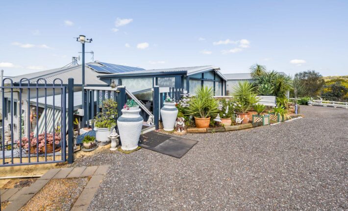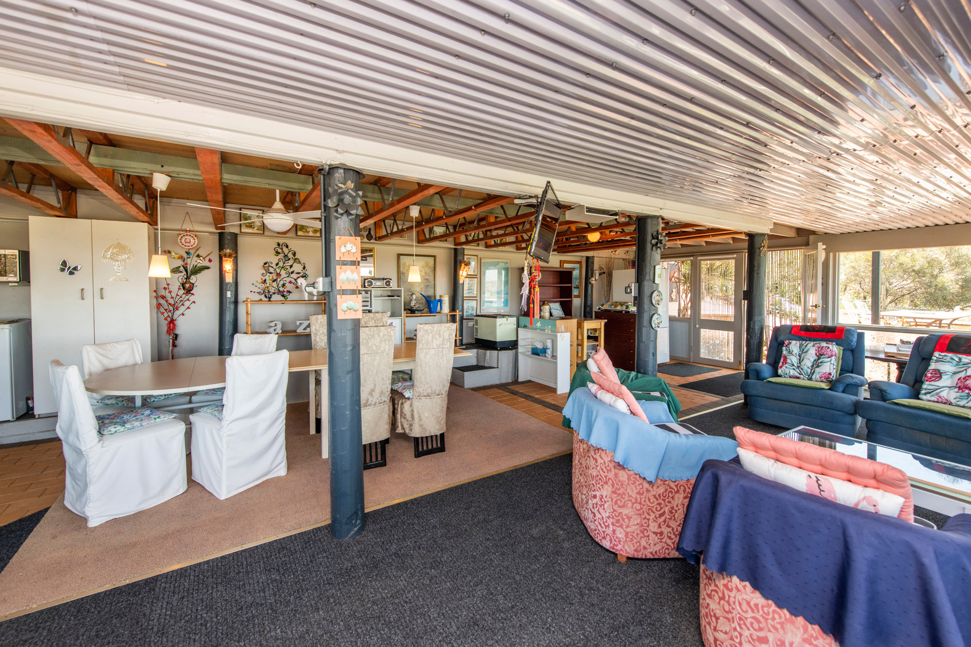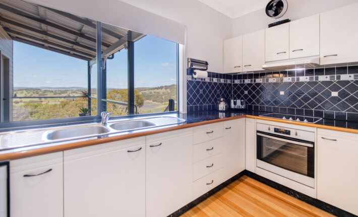 This distinctive home is set on 5 acres of natural bushland overlooking farmland and the hills beyond. Everything about this exclusive 3×2 has relaxation and enjoyment in mind. The sunroom is so warm and cosy in the wintertime, with ceiling fan, and laundry and toilet leading off. Enter the main dwelling and the open plan living draws in the expansive scenery through the wall of glass and onto the relaxing deck for those afternoon sundowners.