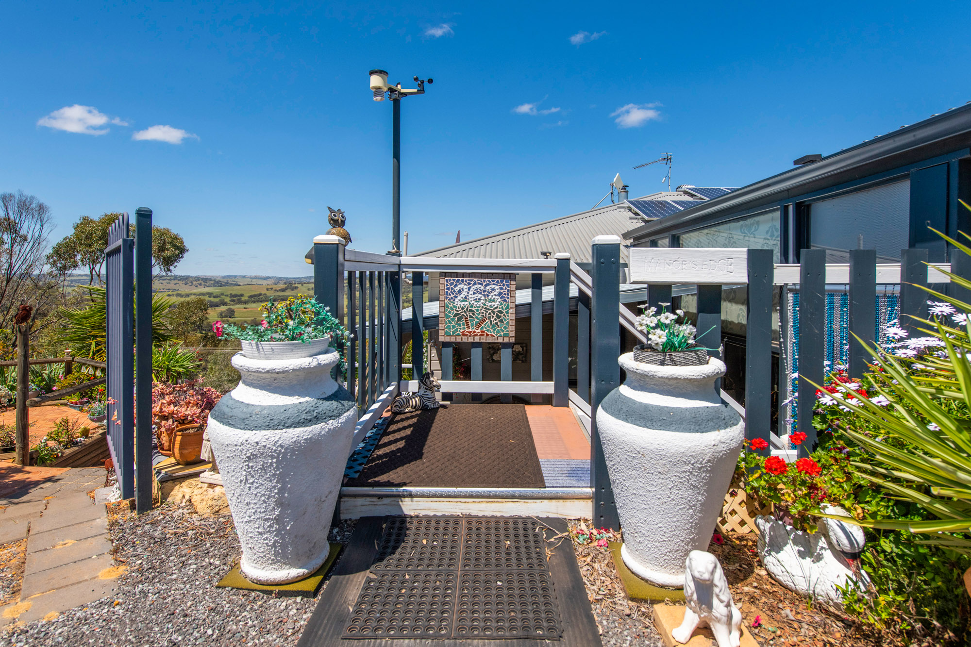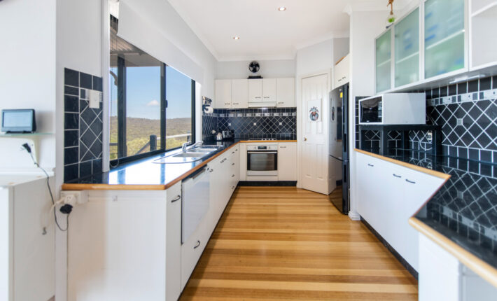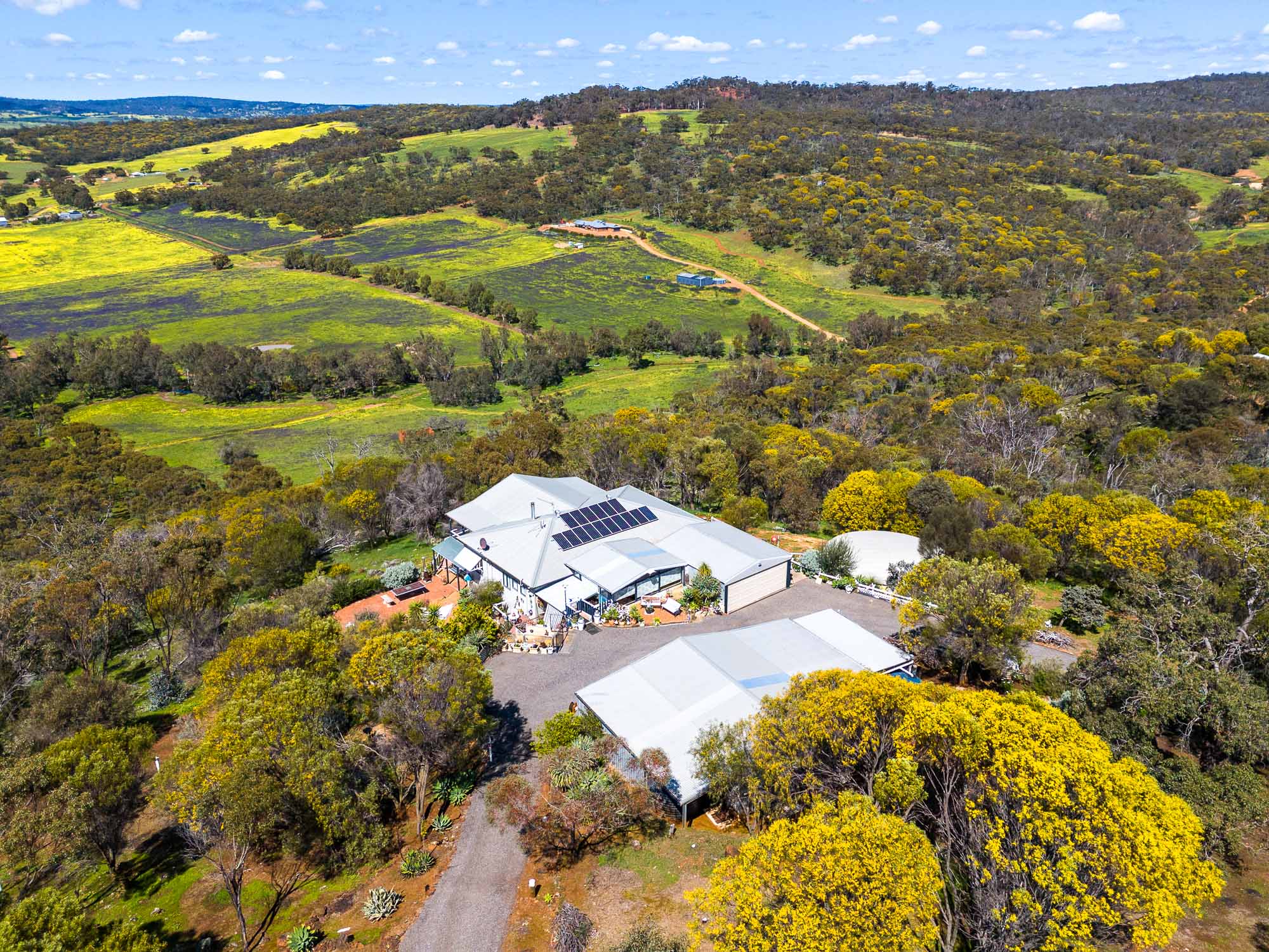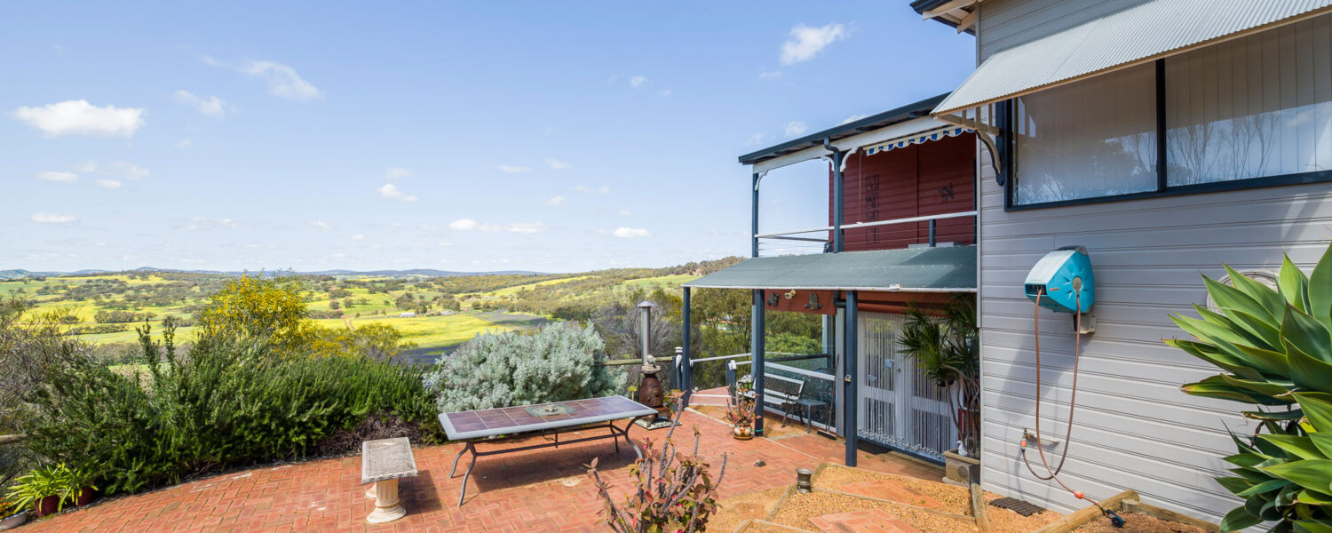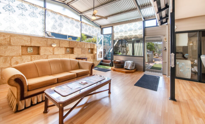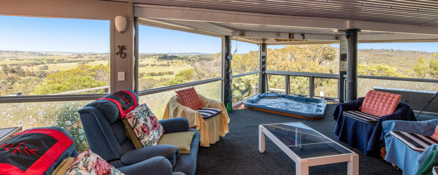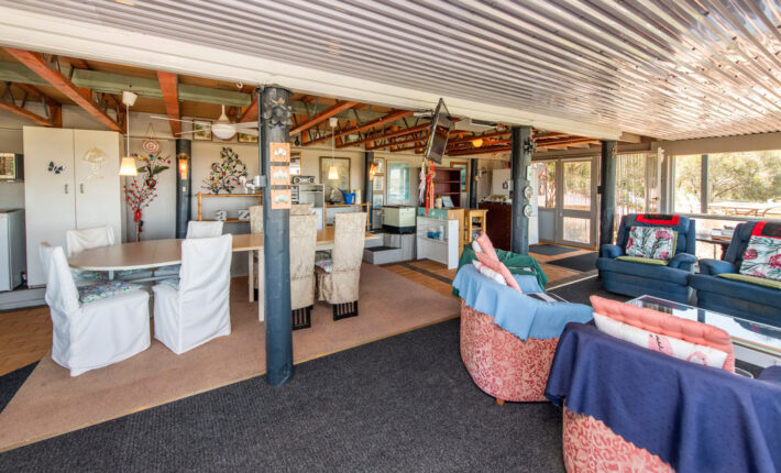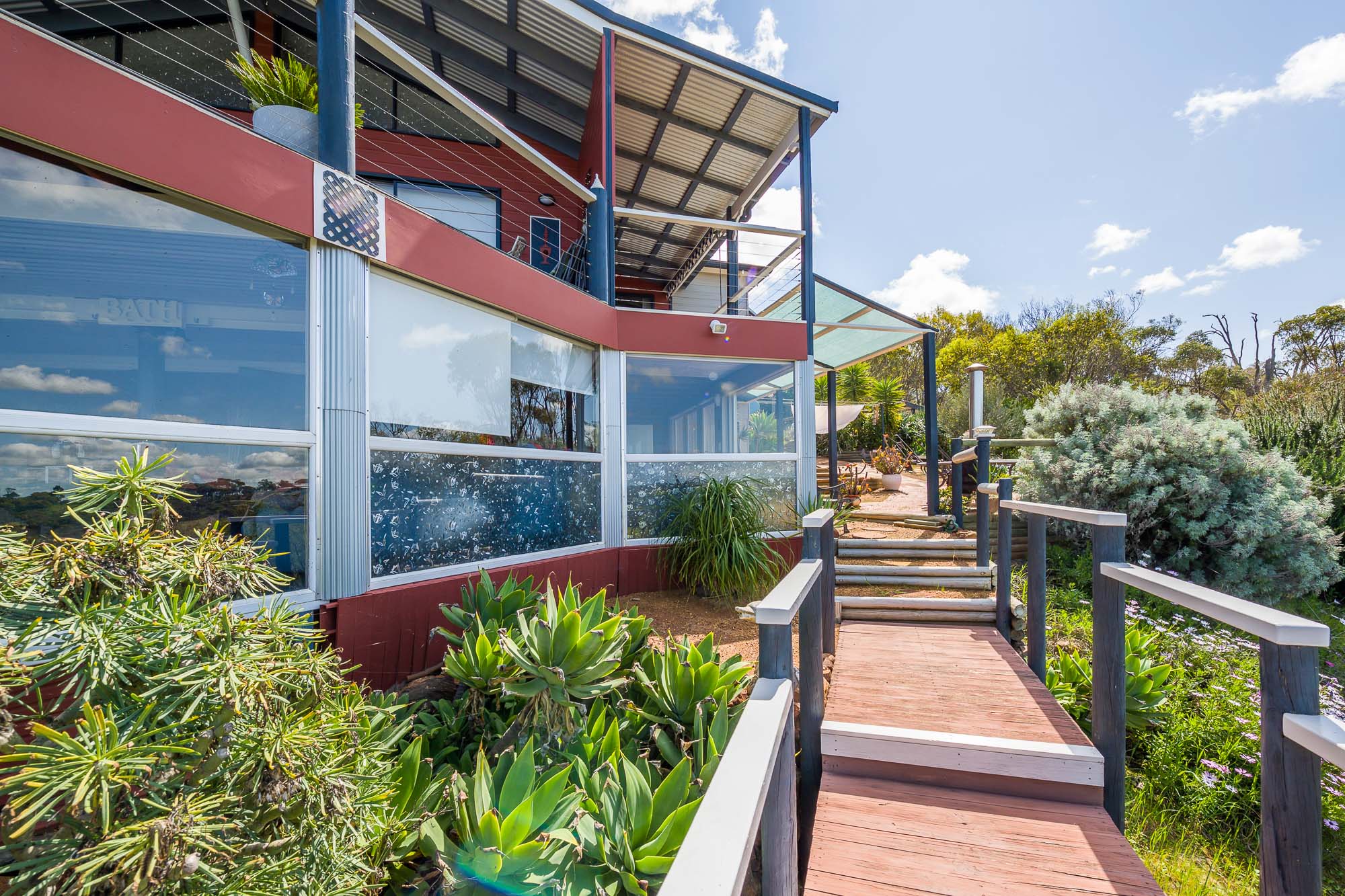 This distinctive home is set on 5 acres of natural bushland overlooking farmland and the hills beyond. Everything about this exclusive 3×2 has relaxation and enjoyment in mind. The sunroom is so warm and cosy in the wintertime, with ceiling fan, and laundry and toilet leading off. Enter the main dwelling and the open plan living draws in the expansive scenery through the wall of glass and onto the relaxing deck for those afternoon sundowners.