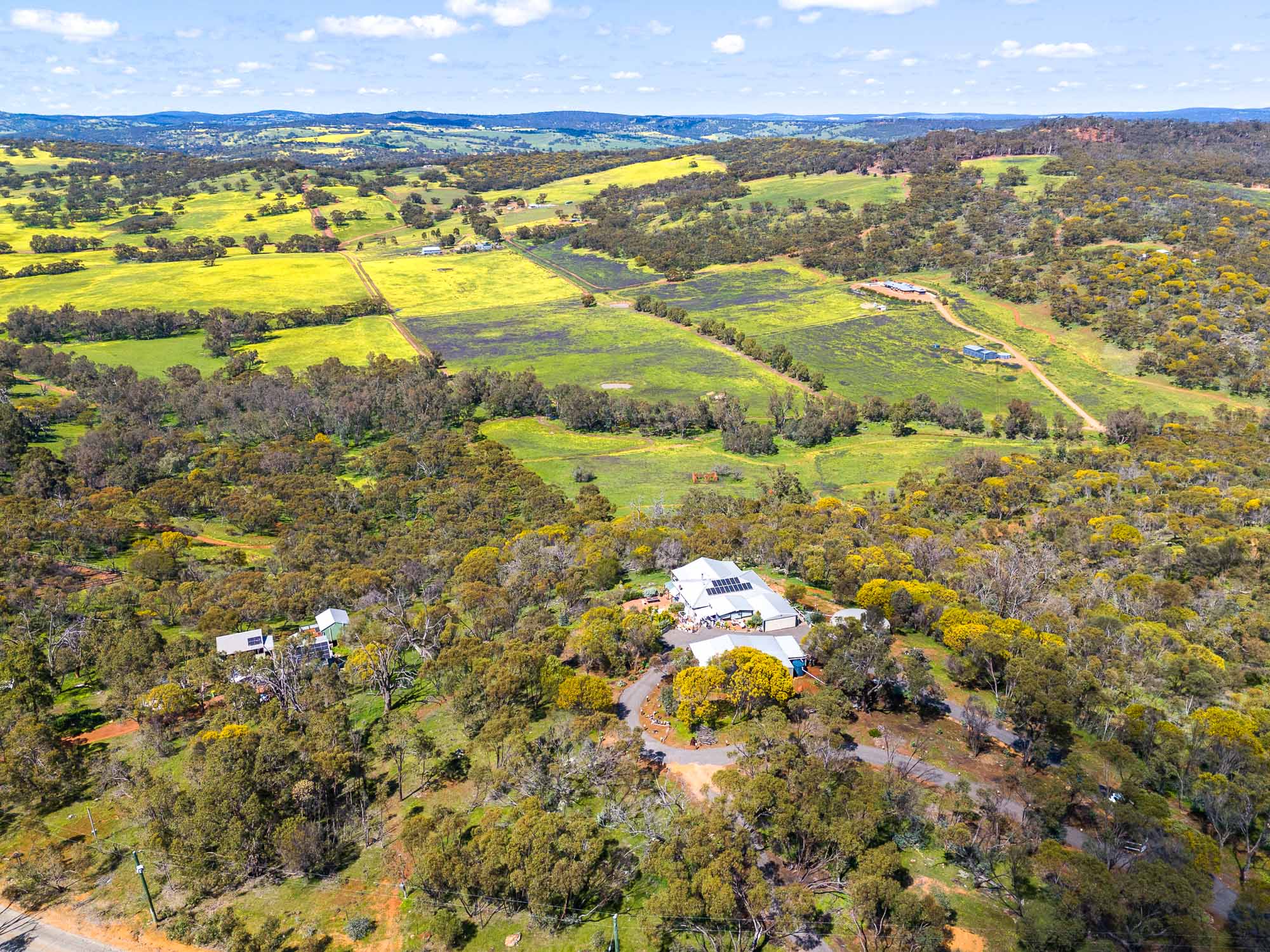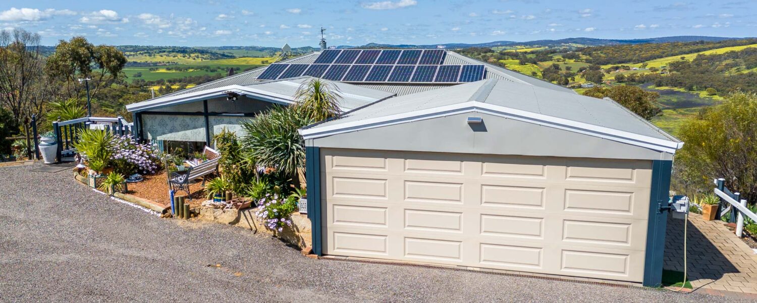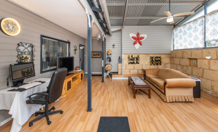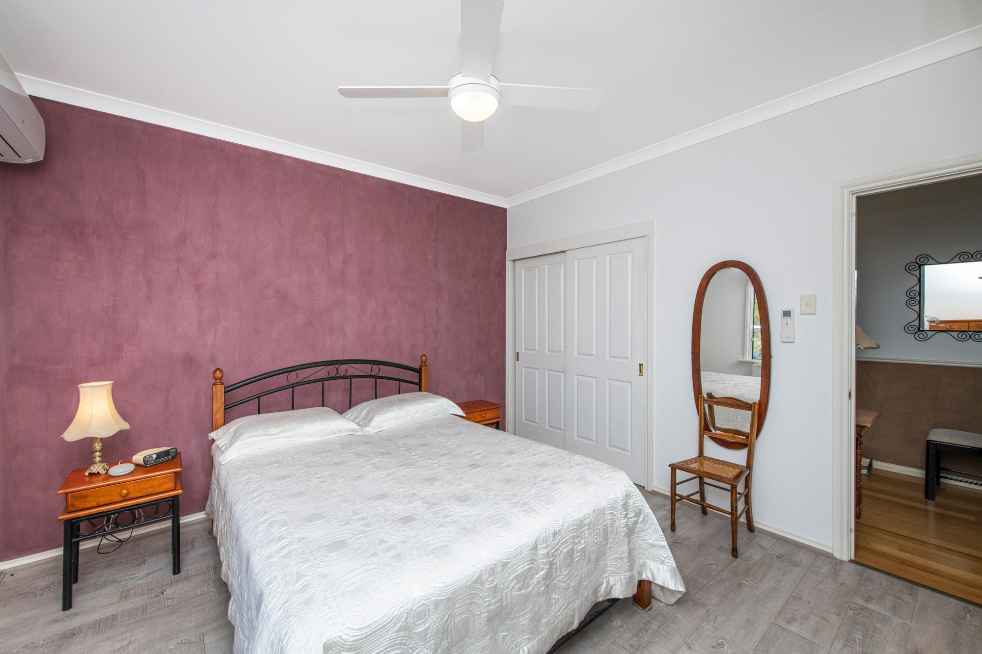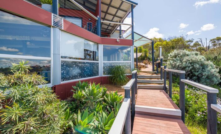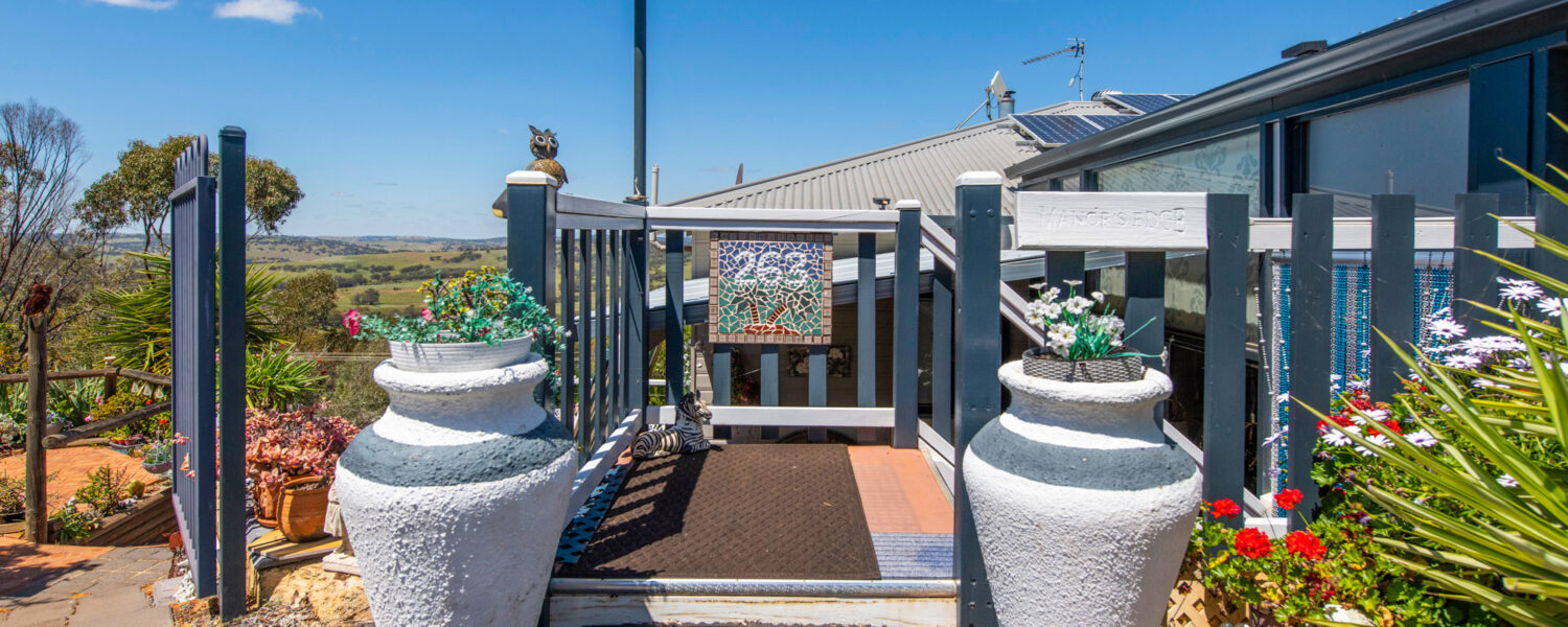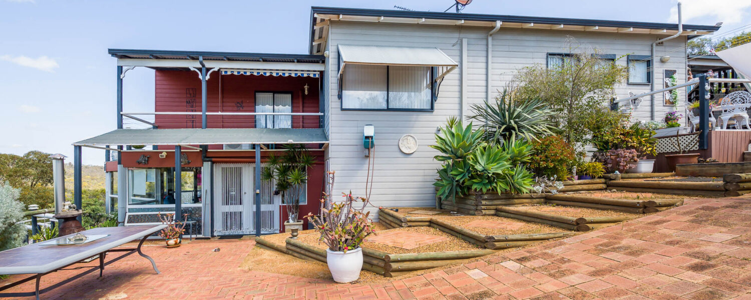 This distinctive home is set on 5 acres of natural bushland overlooking farmland and the hills beyond. Everything about this exclusive 3×2 has relaxation and enjoyment in mind. The sunroom is so warm and cosy in the wintertime, with ceiling fan, and laundry and toilet leading off. Enter the main dwelling and the open plan living draws in the expansive scenery through the wall of glass and onto the relaxing deck for those afternoon sundowners.