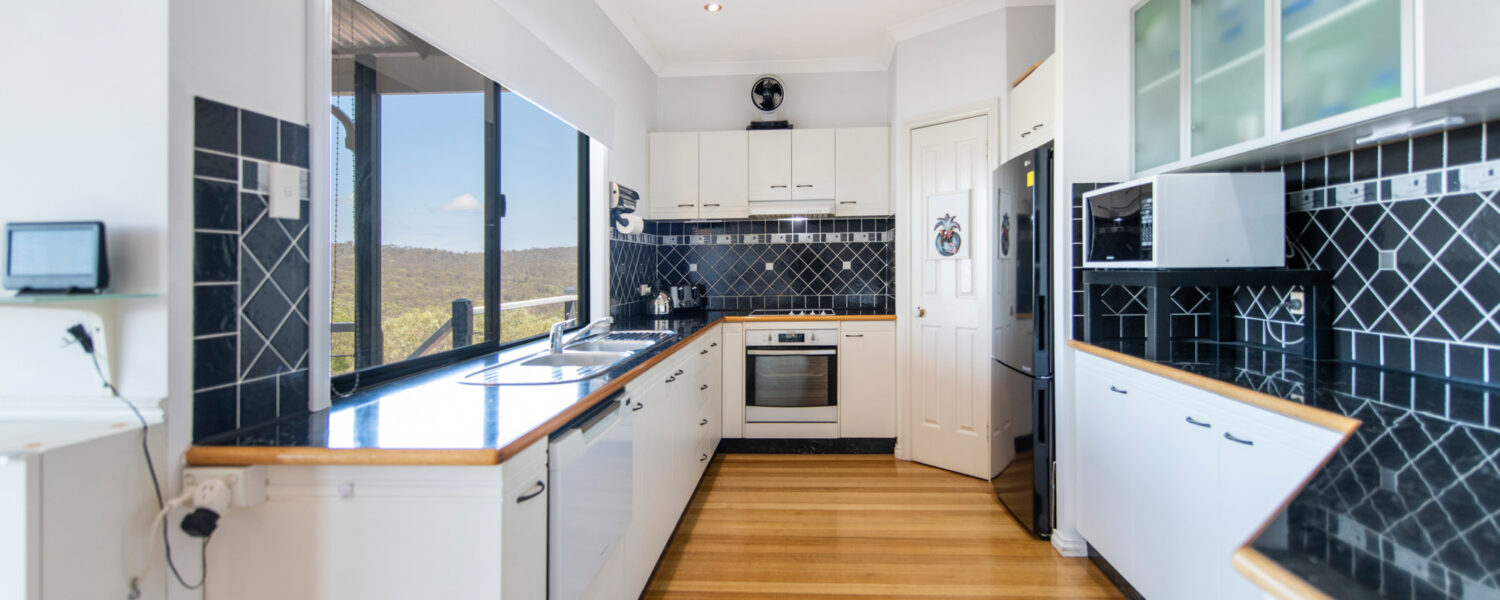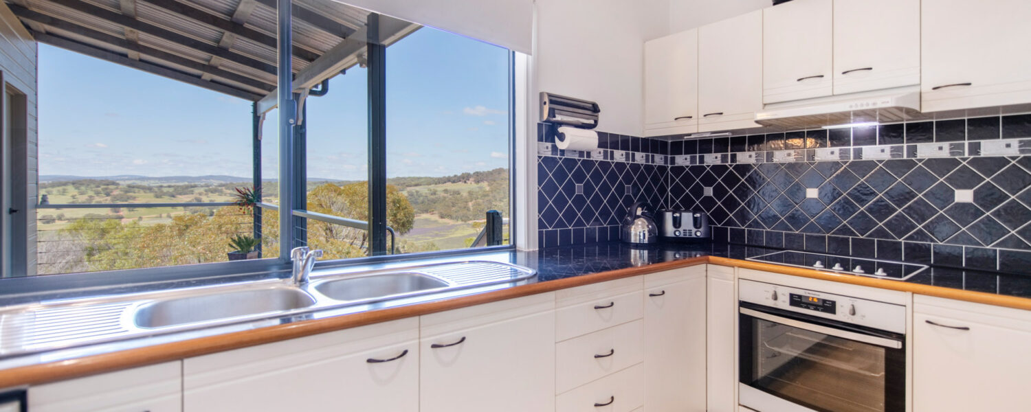 The modern galley kitchen has a dishdrawer and electric cooking. The dining/living area has a warm log fire, reverse cycle aircon and ceiling fan.