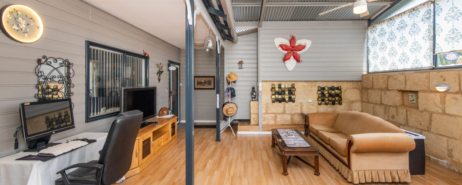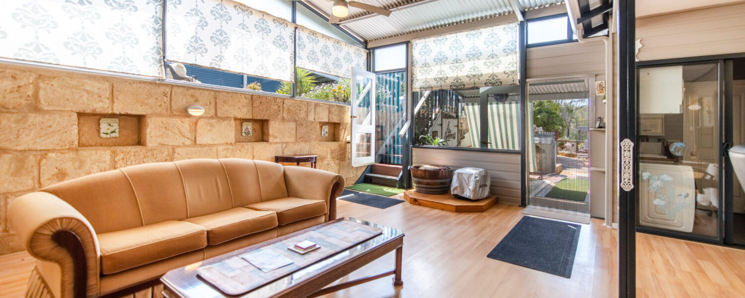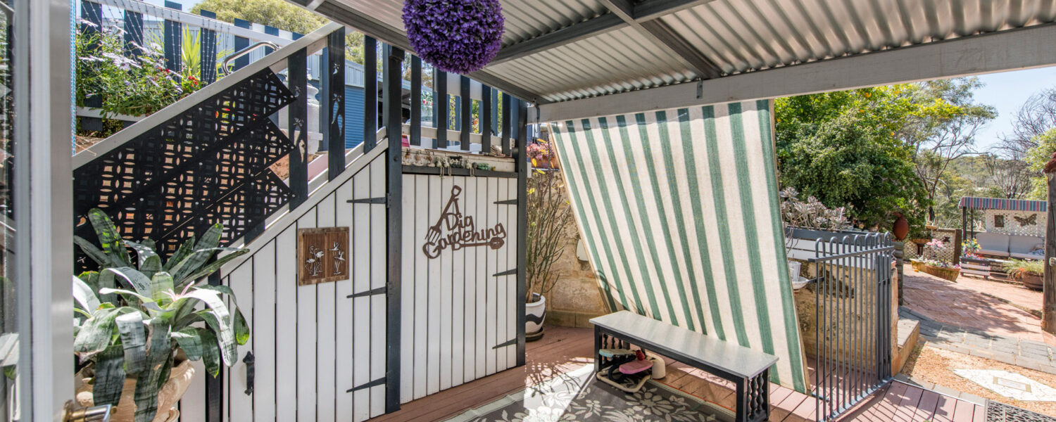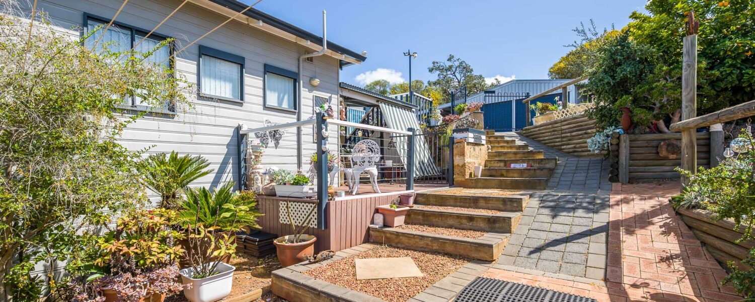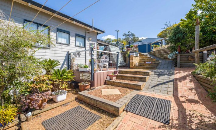 This property has many little thoughtful extras, and surrounded by colourful pots and easy care gardens with resting places for quiet contemplation.