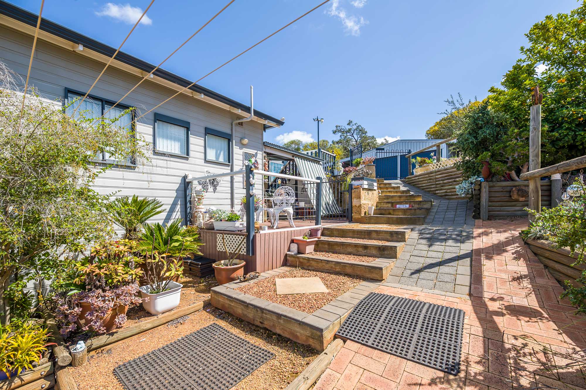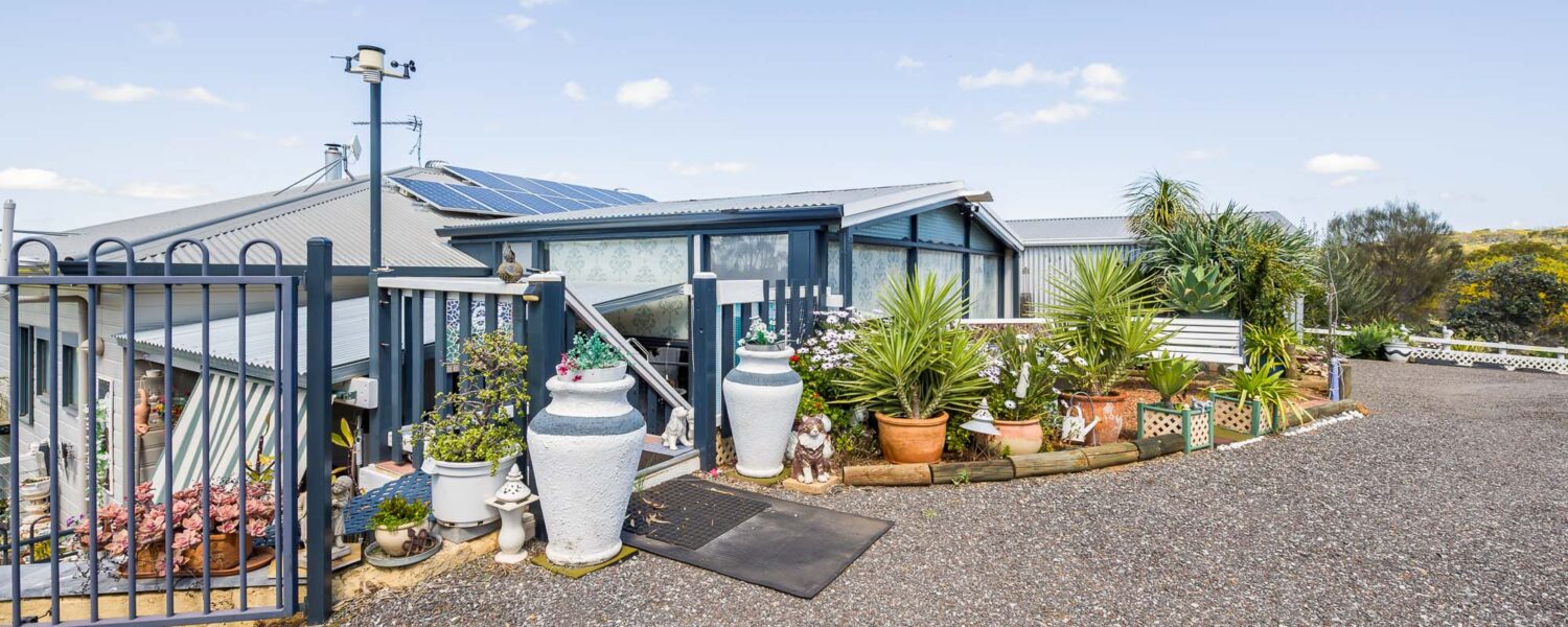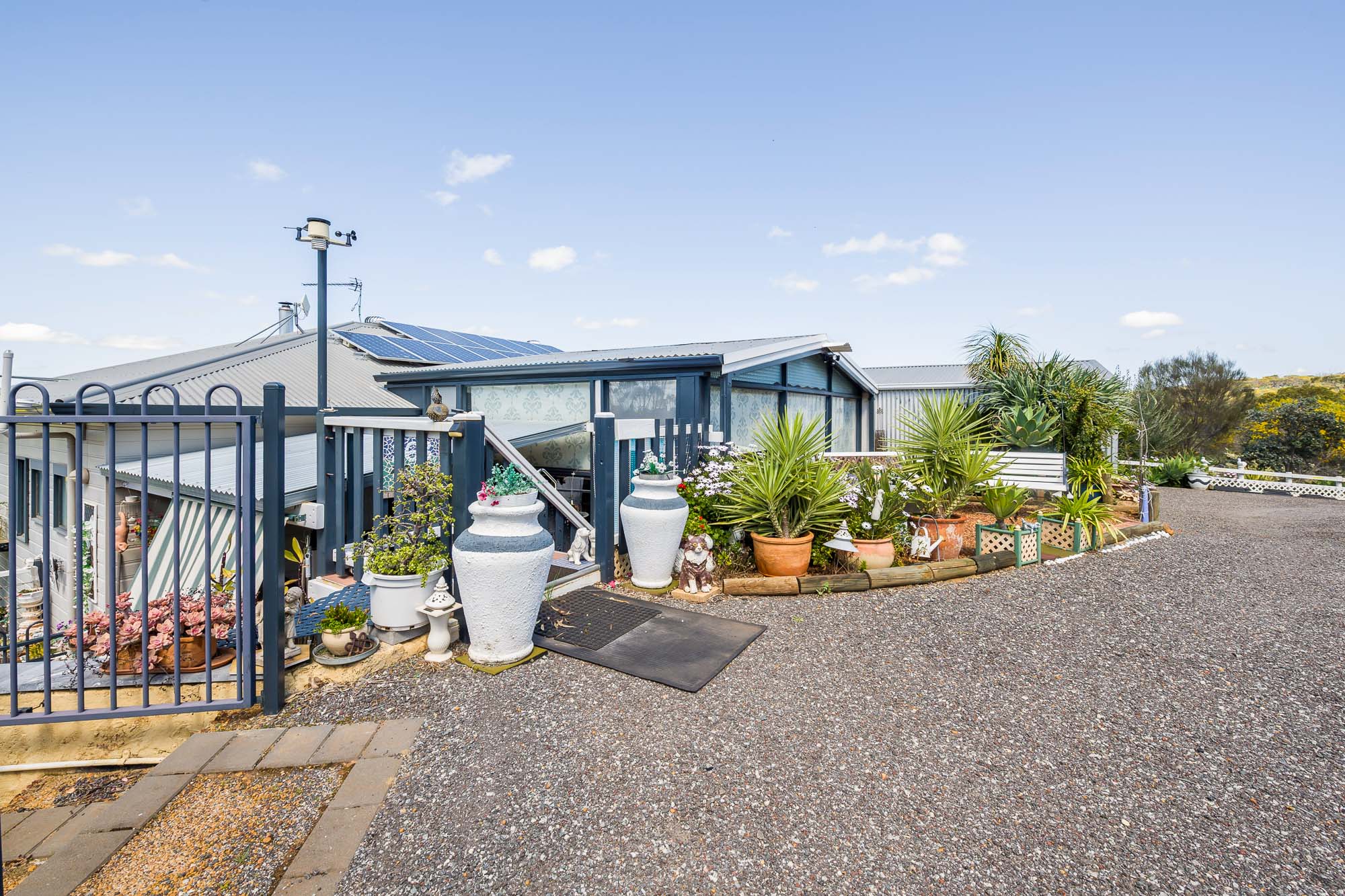 Secret storage areas are tucked into nooks and crannies here and there. 3.6kw Solar panels provide cheaper power and rain water tanks provide the house and gardens. A two bay powered shed has roller doors and lean-to either side and there is a secure garage leading into the dwelling. The colourful entrance is guarded by solar electric gates.
