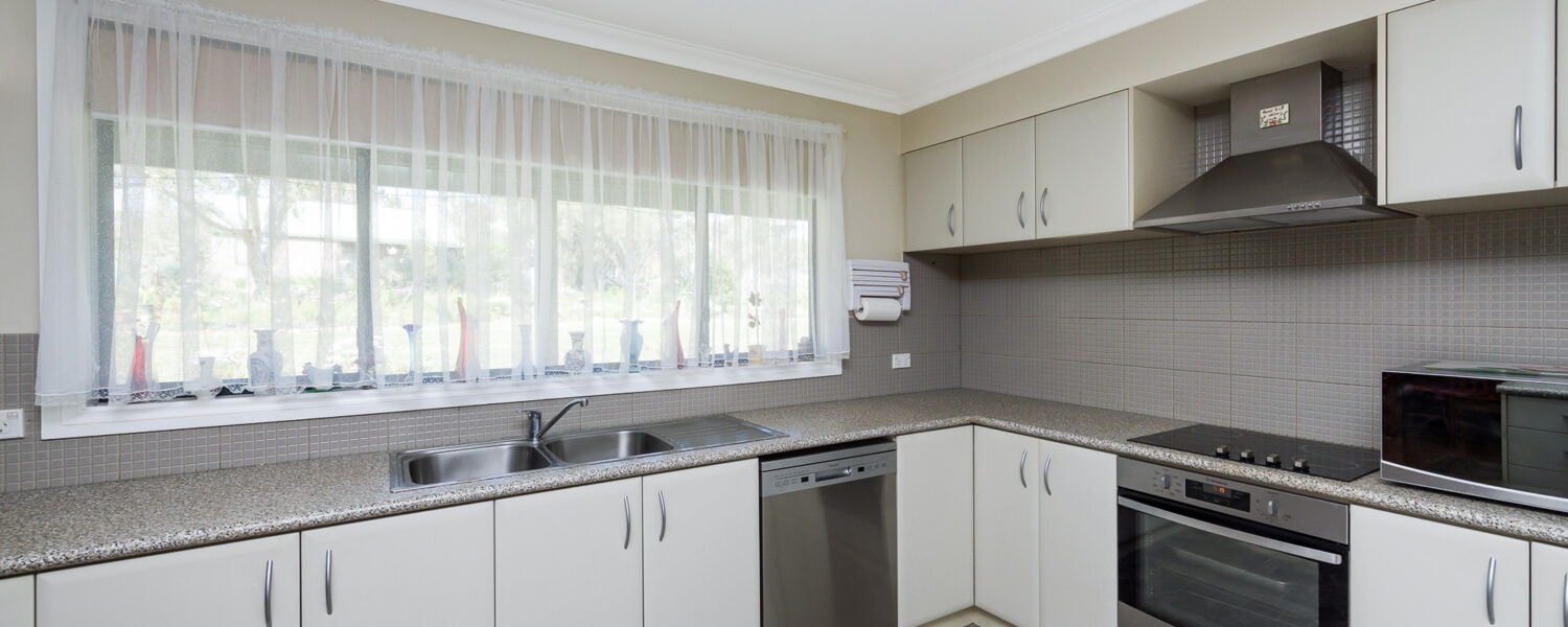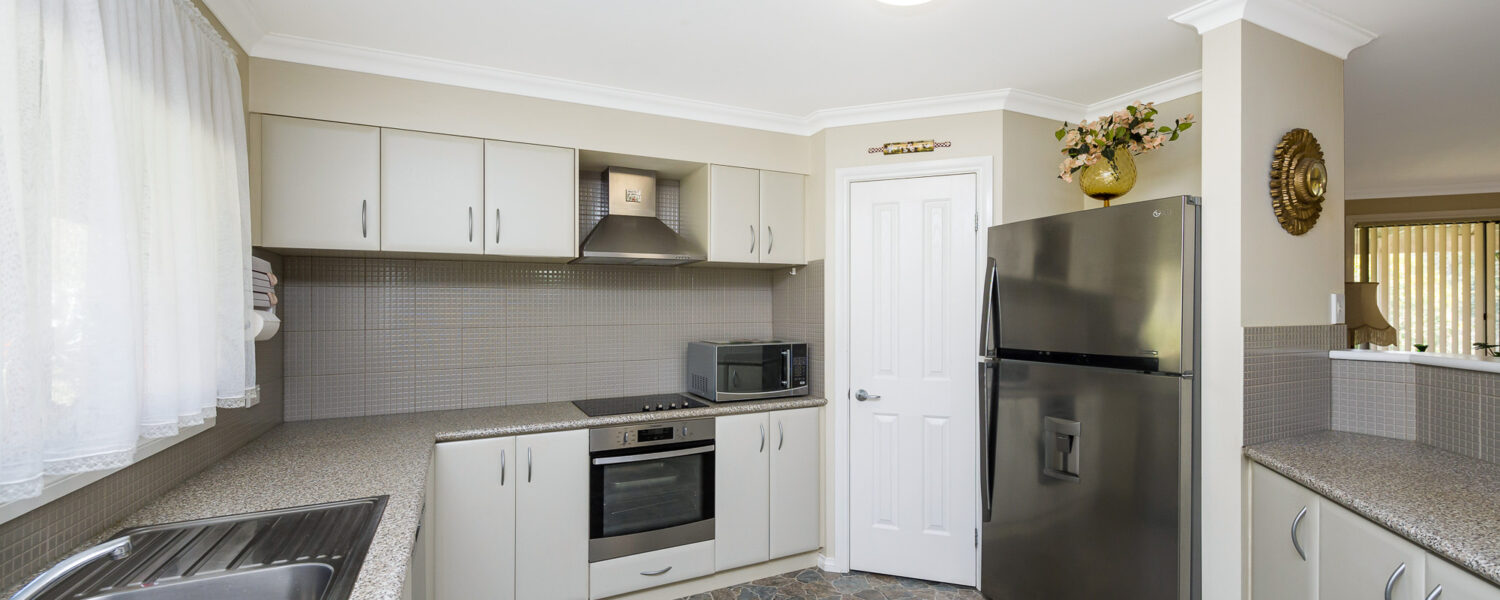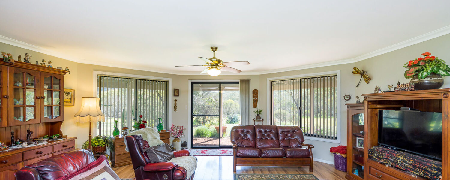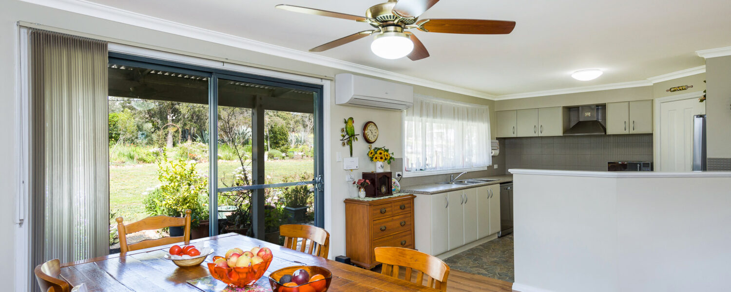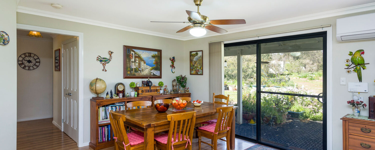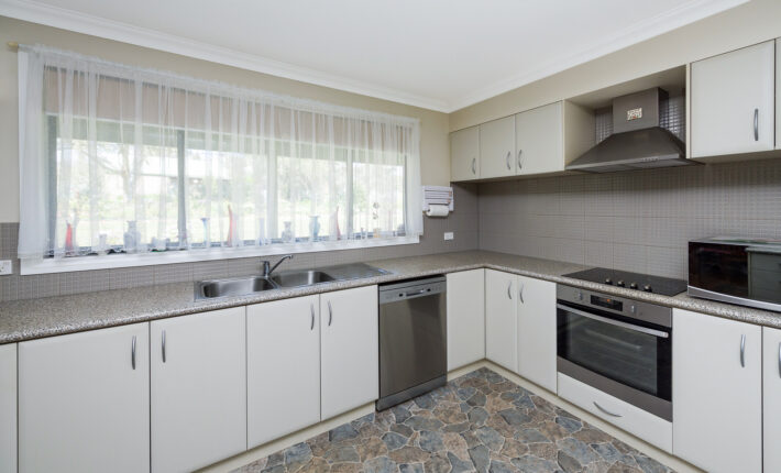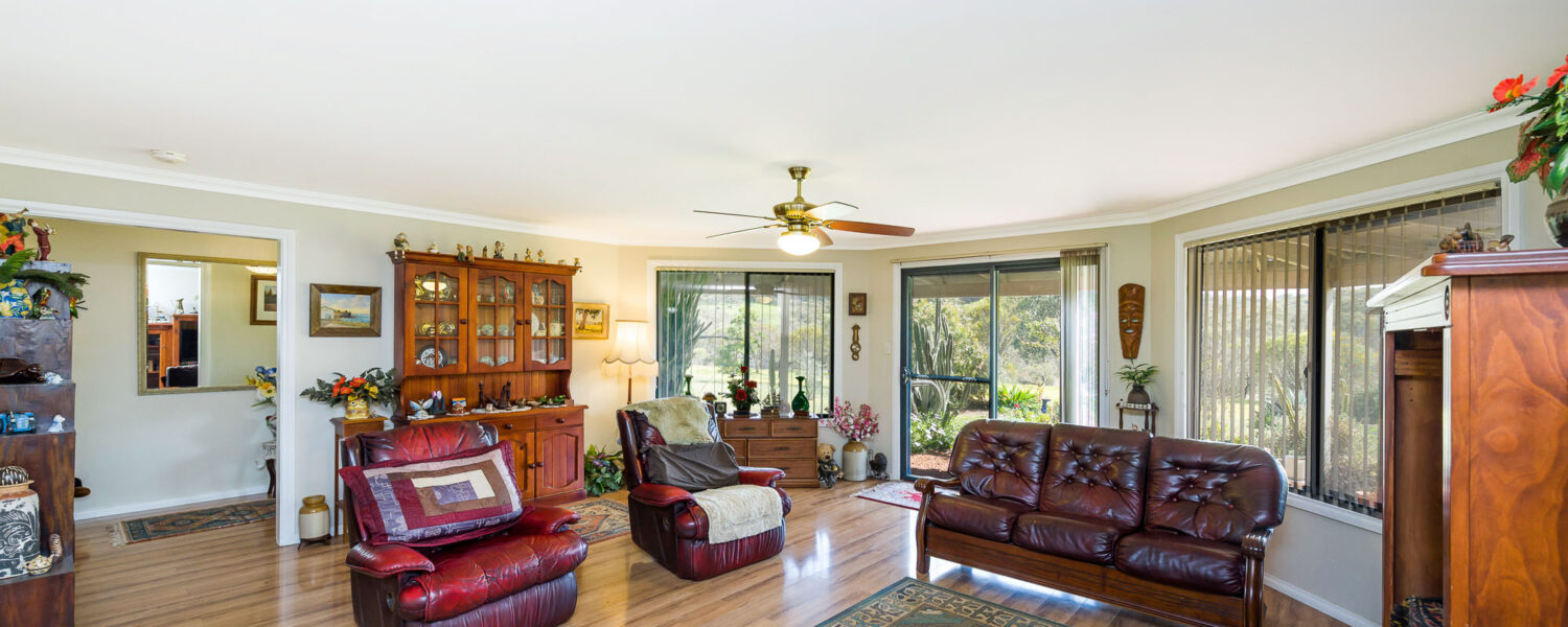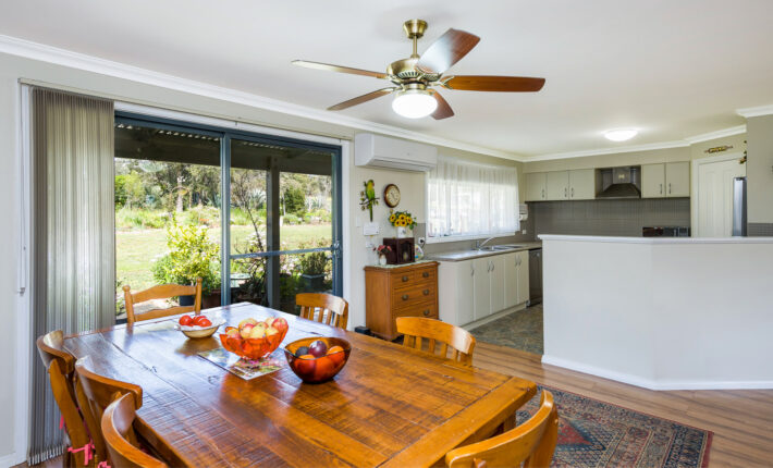 The kitchen has electric H/P and oven with hood and dishwasher, and opens to the living area with reverse cycle aircon and ceiling fan, with adjacent sitting room.