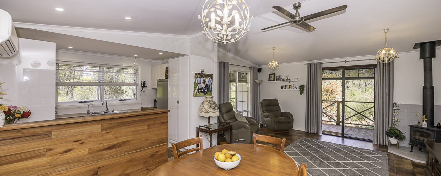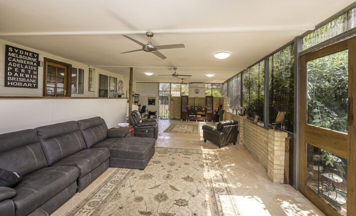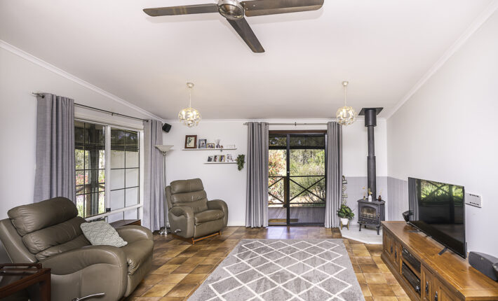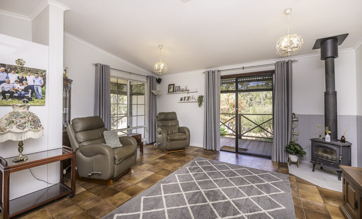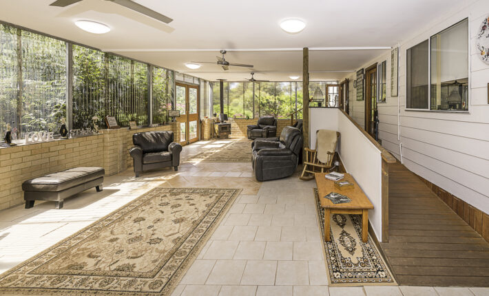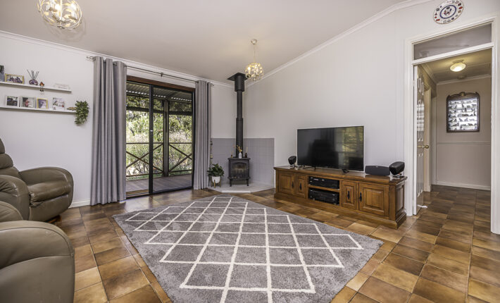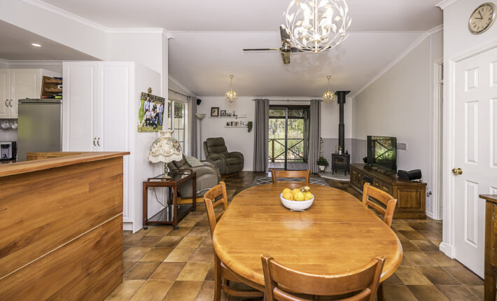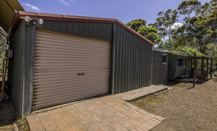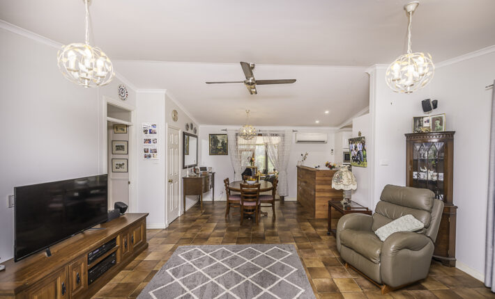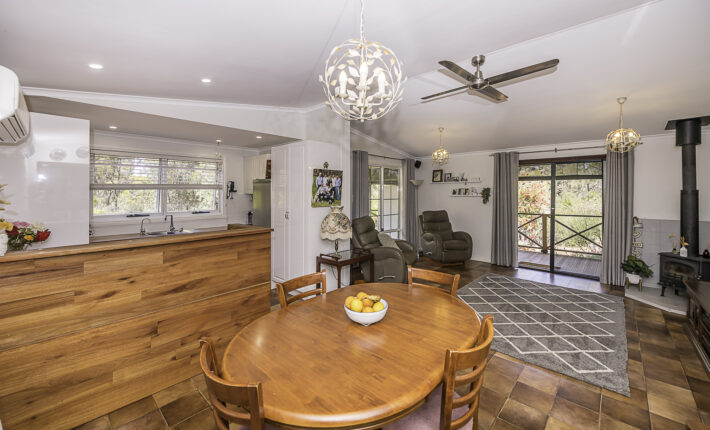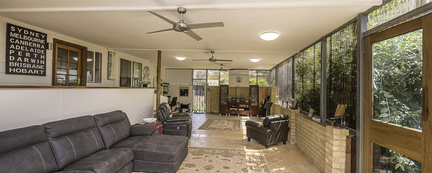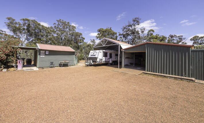 Outdoors is a 6m x 6m powered garage with concrete floor and remote door with lock up section, a caravan c/port, a powered workshop and various smaller sheds. There is a 105,000 litre rain water tank and 2 x 5,000 litre tanks, chook pen, fruit salad orchard and veggie patch.